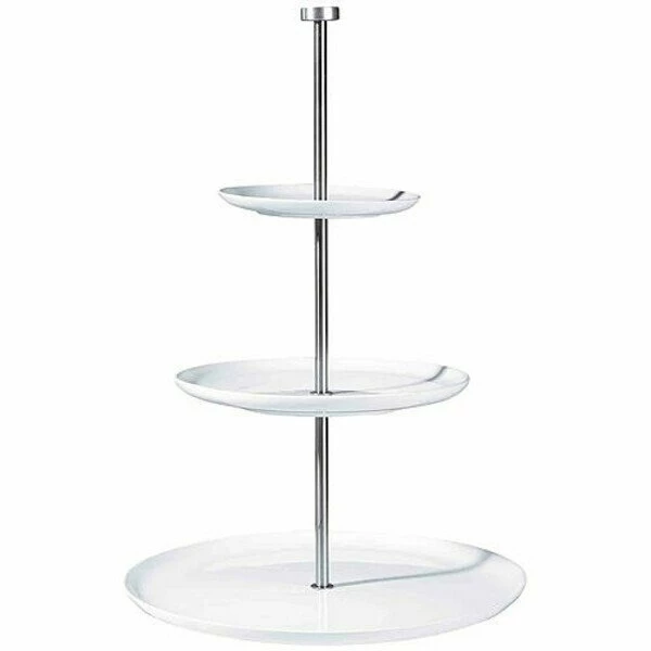 Ein Blickfang für Kaffeetafel und Büffet: Auf drei Etagen von 15 cm, 22 cm und 30 cm Durchmesser und bis in die luftige Höhe von 49 cm lassen sich Leckereien auf der Etagere aus der Serie Grande dekorativ, übersichtlich und für jeden Gast bequem erreichbar anrichten. Weißer Keramik und Edelstahl bieten mit unaufdringlicher Funktionalität hübschen Leckerbissen eine adäquate Bühne. Der Hersteller ASA bietet mit der flachen Etagere die Möglichkeit, der festlichen Tafel mit Charme das gewisse Etwas zu verleihen.