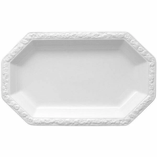 Dieses stilvolle Tafelgeschirr ist ein toller Blickfang für den Tisch. Bei festlichen Anlässen oder als Alltagsporzellan ist es gerne gesehen. Die zeitlose Platte von Rosenthal hat eine Länge von 33 cm und ist 20 cm breit. Sie zeichnet sich durch ihre vieleckige Form und ein zierliches Granatapfel-Relief aus. Die Geschirrplatte aus der Serie Maria Weiss wurde aus hochwertigem Hartporzellan hergestellt und ist daher von erster Wahl. Für die Mikrowelle sowie für die Spülmaschine ist sie bestens geeignet.
