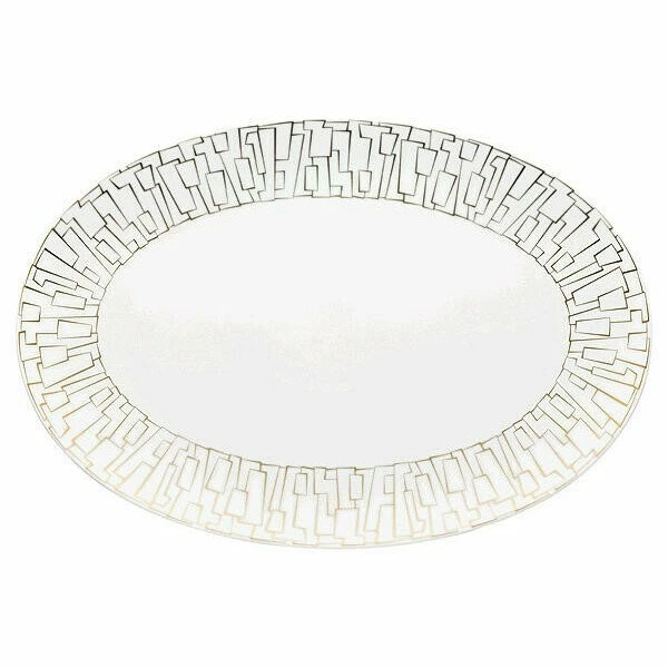 Die ovale Platte bietet vielfältige Möglichkeiten zum Servieren und Drapieren Ihrer Speisen, Häppchen oder Kuchen. Das weiße Porzellan ist am Rand verfeinert mit einem filigranen Golddekor, das sich mosaikartig verzweigt.