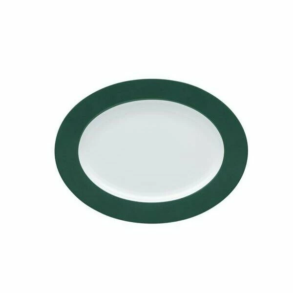 Die ovale Platte Sunny Day Herbal Green von Thomas besticht durch ihr dunkles Grün, das mit dem weißen Spiegel ein kontrastierendes Farbspiel eingeht. So lassen sich Kuchenstücke oder kleine Häppchen lebhaft inszenieren.