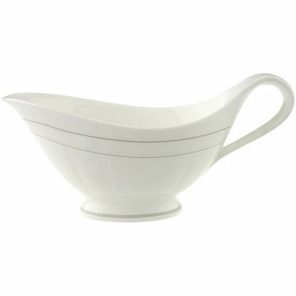 Das Saucieren-Oberteil von Villeroy & Boch besteht aus Premium Bone Porcelain mit einem ganz leichten Grauton. Zusammen mit dem Dekor aus dezenten grauen Linien wirkt die Soßenschüssel fein und elegant. Der Hersteller vertraut einer klassischen Form mit geschwungenem Griff und einer angedeuteten Ausgusslippe. Trotz dieser klassischen Form vermittelt das Saucieren-Oberteil eine angenehme Frische. Es fasst 400 ml und ist für die Spülmaschine geeignet.