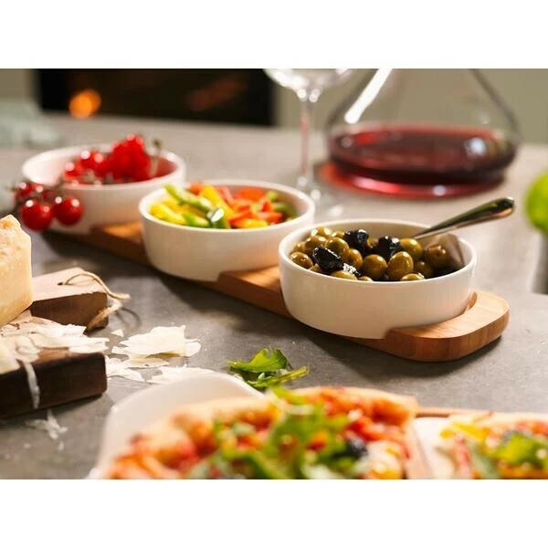 Ob nun die frischen Champignons, die herzhafte Salami oder der frische Mozzarella – beim Backen leckerer Pizza stellt sich immer die Frage, wo die Zutaten am besten aufzubewahren sind. Die Toppingplatte der Serie Pizza Passion von Villeroy & Boch ist hierbei garantiert die richtige Wahl. In den drei Schälchen finden Ihre Zutaten sicher Platz und warten auf ihren Einsatz. Durch die hochwertige Platte aus Bambus haben die Schälchen aus hochwertigem Porzellan optimalen Halt und können sicher an Freunde und Familie weitergereicht werden.